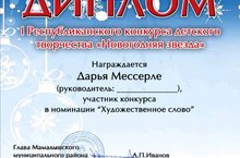Наша воспитанница Мессерле Дарья стала участницей I Республиканского конкурса детского творчества "Новогодняя звезда" в номинации "Художественное слово" и получила диплом за участие.