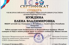 Сертификат спикера получила наша заведующая Нуждина Елена Владимировна, за участие в 8 Всероссийском форуме "Дошкольники России",где представила презентацию на тему"Работа детских садов Альметьевска во Всероссийском марафоне "Живой словарик по ПДД в нашем родном краю"