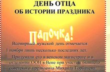 1 ноября - День отца! 01.11.2014 Быть папой – огромное счастье! Быть папой – забота и труд! Храните семью от ненастья, Ведь вас там и любят и ждут! Звучит лучшей песней на свете Биение детских сердец, Навек вам присвоили дети Высокое званье – «Отец»!
