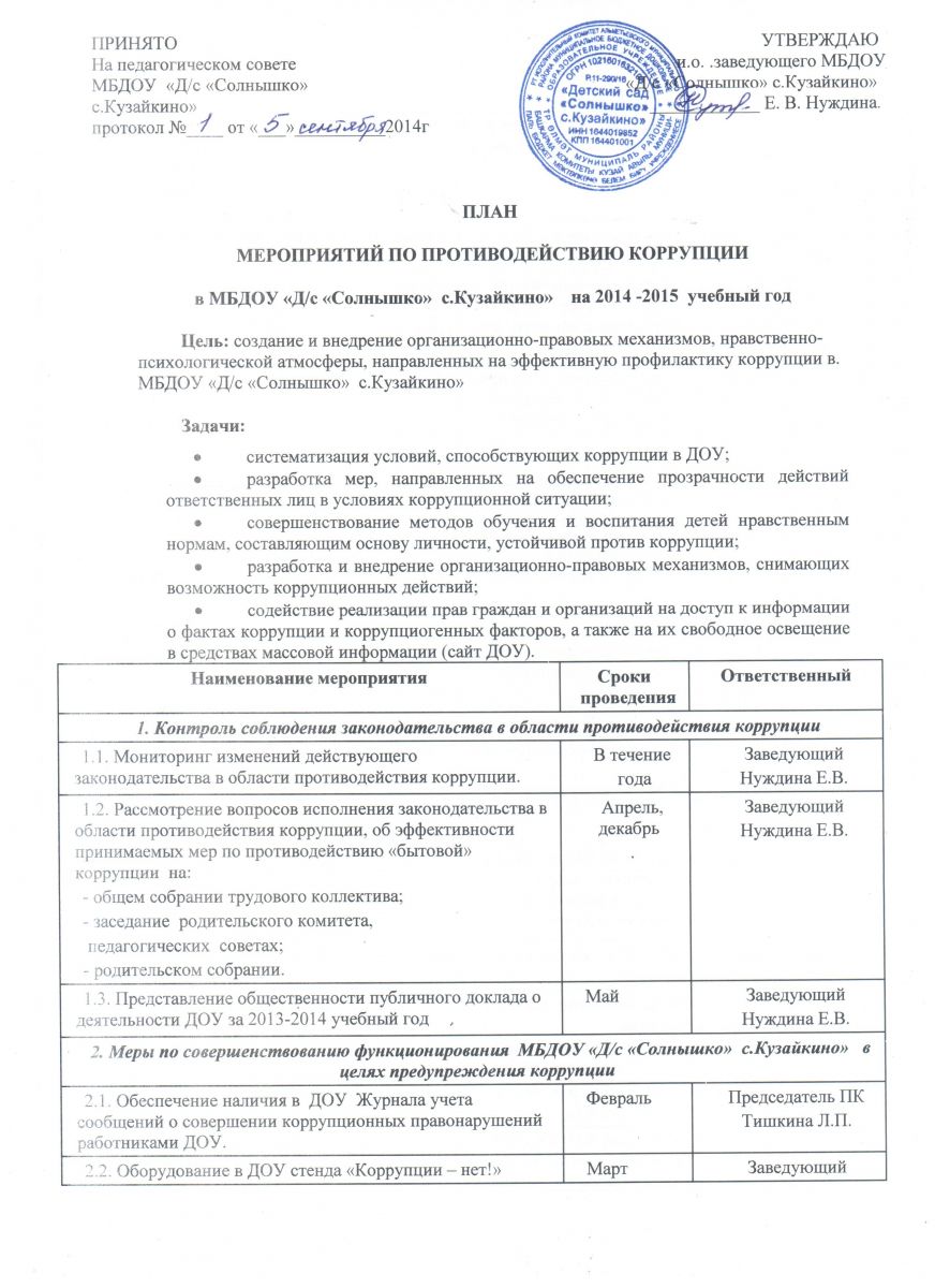 План мероприятий по противодействию коррупции на 2014-2015 учебный год
