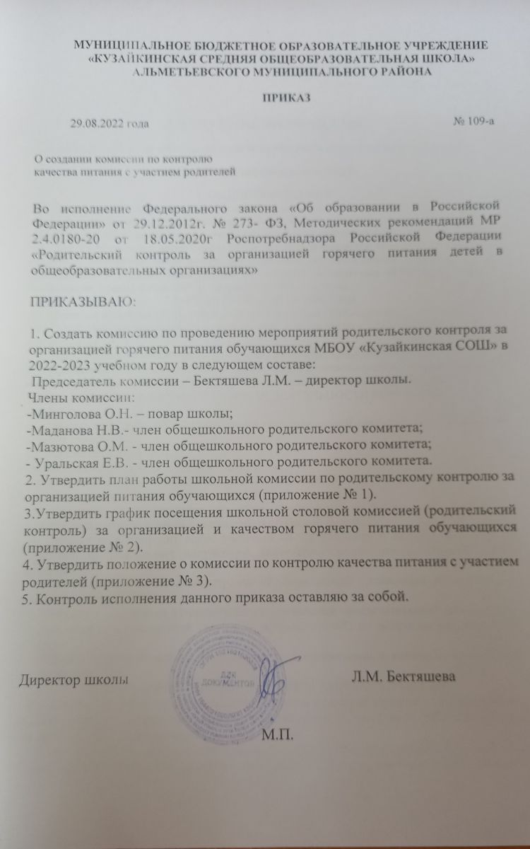 8.1. Приказ о создании комиссии по контролю качества питания с участием родителей