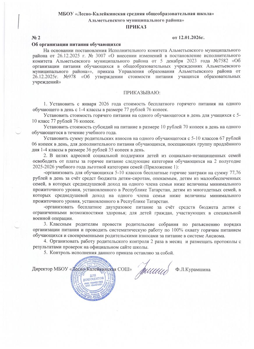 Приказ 2 от 12.01.2026 Об организации питания с января 2026 года