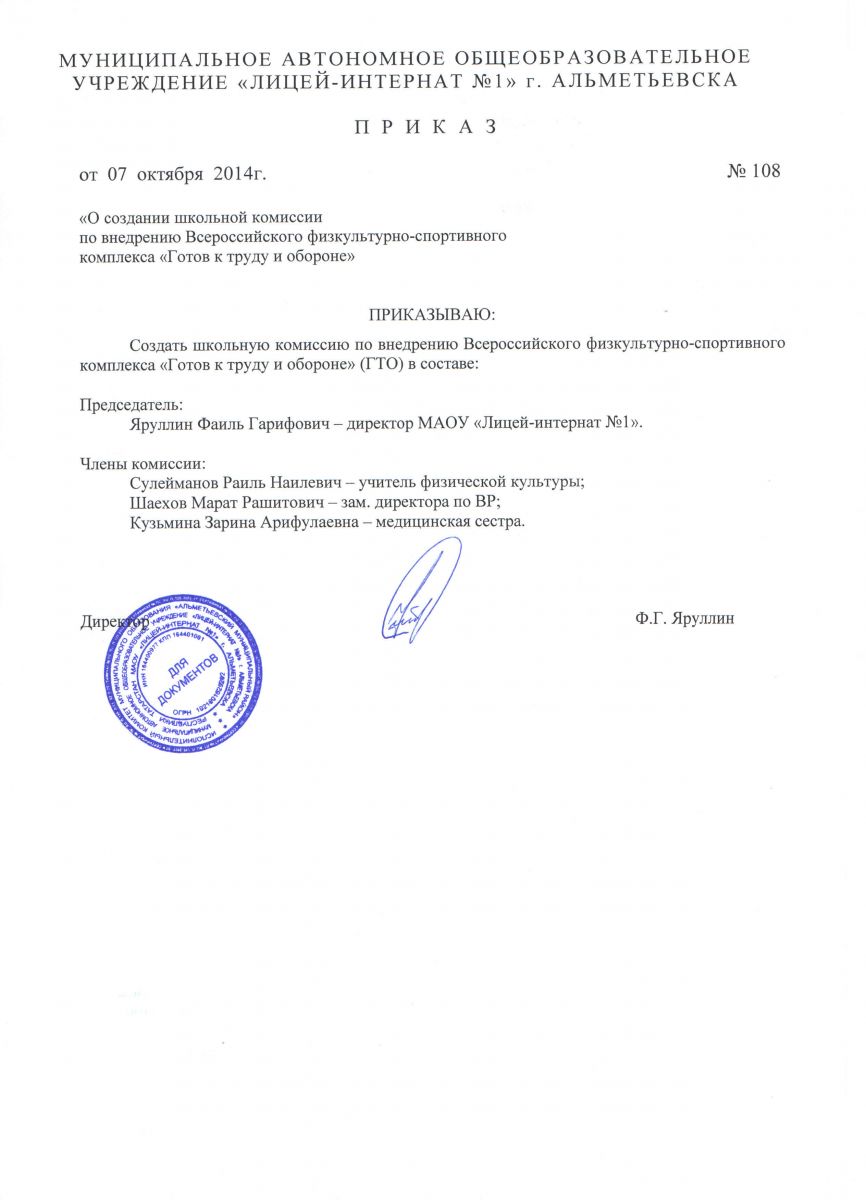- Приказ о создании школьной комиссии по внедрению Всероссийского физкультурно-спортивного комплекса «Готов к труду и обороне»