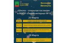Во время весенних каникул в нашем лицее откроет свои двери школьная гостиная. 25 марта с 9:00 до 11:00 состоится турнир по футболу, с 11:00 до 12:30 - открытый ковер «Борцовские схватки». Приглашаем учащихся 7-11 классов и их родителей принять участие на данных мероприятиях. 28 марта для учащихся 5-6 классов в лицее состоится квест-игра «Весенний переполох». Ждем ребят на этом мероприятии!