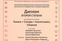 10-11 декабря 2016 года в городе Санкт-Петербург проходил заключительный этап Всероссийской Командной Олимпиады Школьников по программированию. Отборочный региональный этап проходил в городе Иннополис, где команды нашего лицея взяли дипломы второй и третей степени. В заключительный этап прошла команда Казань + Самара + Альметьевск, Сборная (Хусаинов, Курилкин, Ибрагимов).