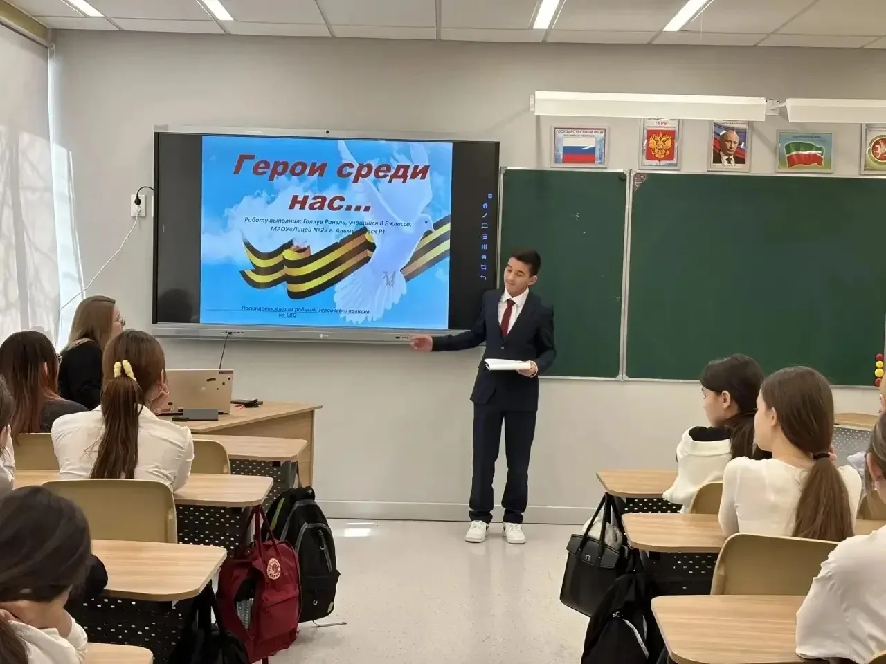 В центре обсуждения была связь поколений. Ребятам рассказали о том, что героизм – это не всегда на поле боя. Это и невероятный трудовой подвиг в тылу в годы Великой Отечественной войны и мужество тех, кто сегодня защищает интересы нашей Родины. В ходе урока прослушали выступление Рахмановой Адели, ученицы 10 «Б» класса, она рассказала о ратном и трудовом подвиге своего прадеда. Говоря о героях настоящего времени прослушали выступление ученика 8 «Б» класса Галяува Ранеля о родственниках, погибших в ходе СВО. Анастасия Николаевна рассказала о работе волонтерского штаба и о важности той помощи, которая оказывается фронту, о ценности писем, которые дети пишут солдатам.