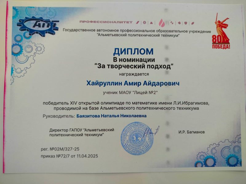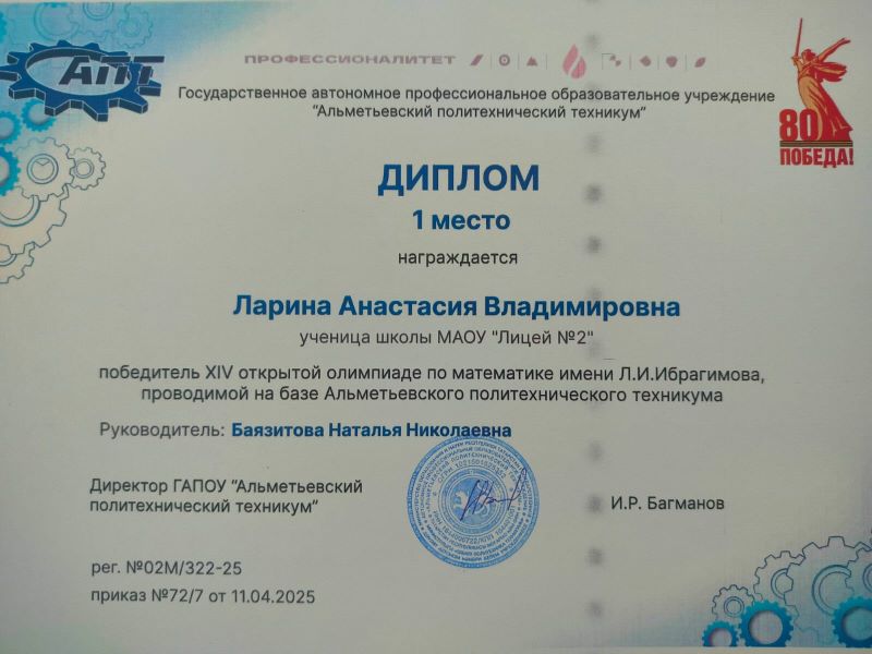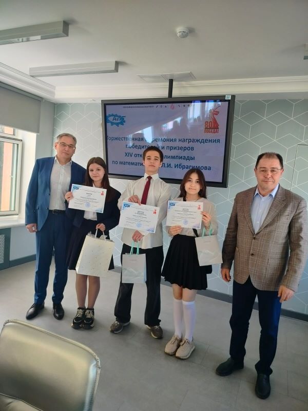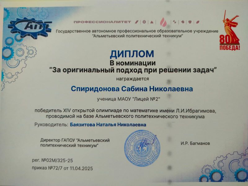 16 апреля состоялась торжественная церемония награждения победителей,призеров и номинантов XIV открытой олимпиады по математике имени Л.И.Ибрагимова, проводимой на базе Альметьевского политехнического техникума. Учащиеся 9а класса Хайруллин Амир и Спиридонова Сабина были отмечены дипломами номинантов за оригинальный и творческий подход при решении задач, Ларина Анастасия награждена Дипломом 1 степени????