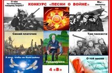 3 апреля в 4 «В» классе прошёл конкурс «Песни о войне». Дети сами выбрали песни, подготовили исполнение – соло, трио, квартет, группа, а жюри из администрации лицея оценило работу учащихся. Прозвучали песни «Три танкиста», «Синий платочек», «Мы – пилоты», «О чём ты тоскуешь, товарищ моряк?», «Прадедушка», «О той весне», «Я хочу, чтобы не было войны». Задорные, грустные, душевные, торжественные песни исходили из самого сердца детей. Завершили мероприятие подведением итогов, поздравлением победителей и минутой молчания.