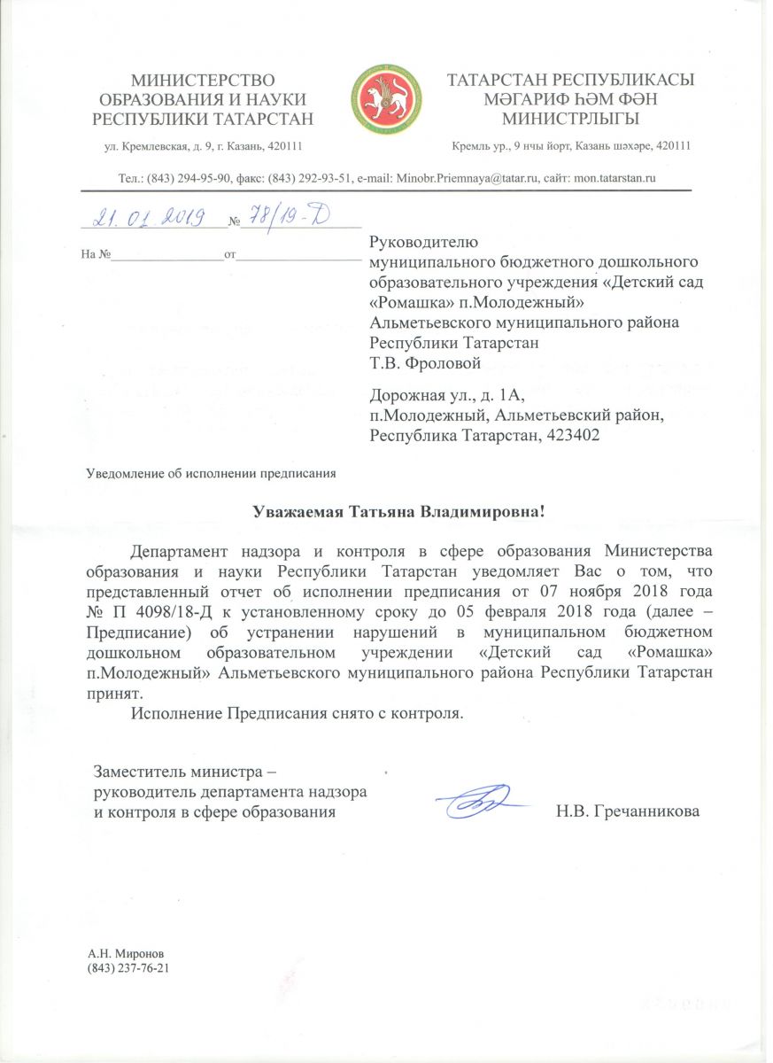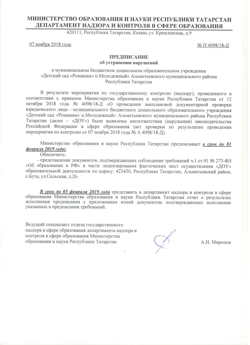 Предписание департамента надзора и контроля в сфере образования МО и Н РТ
