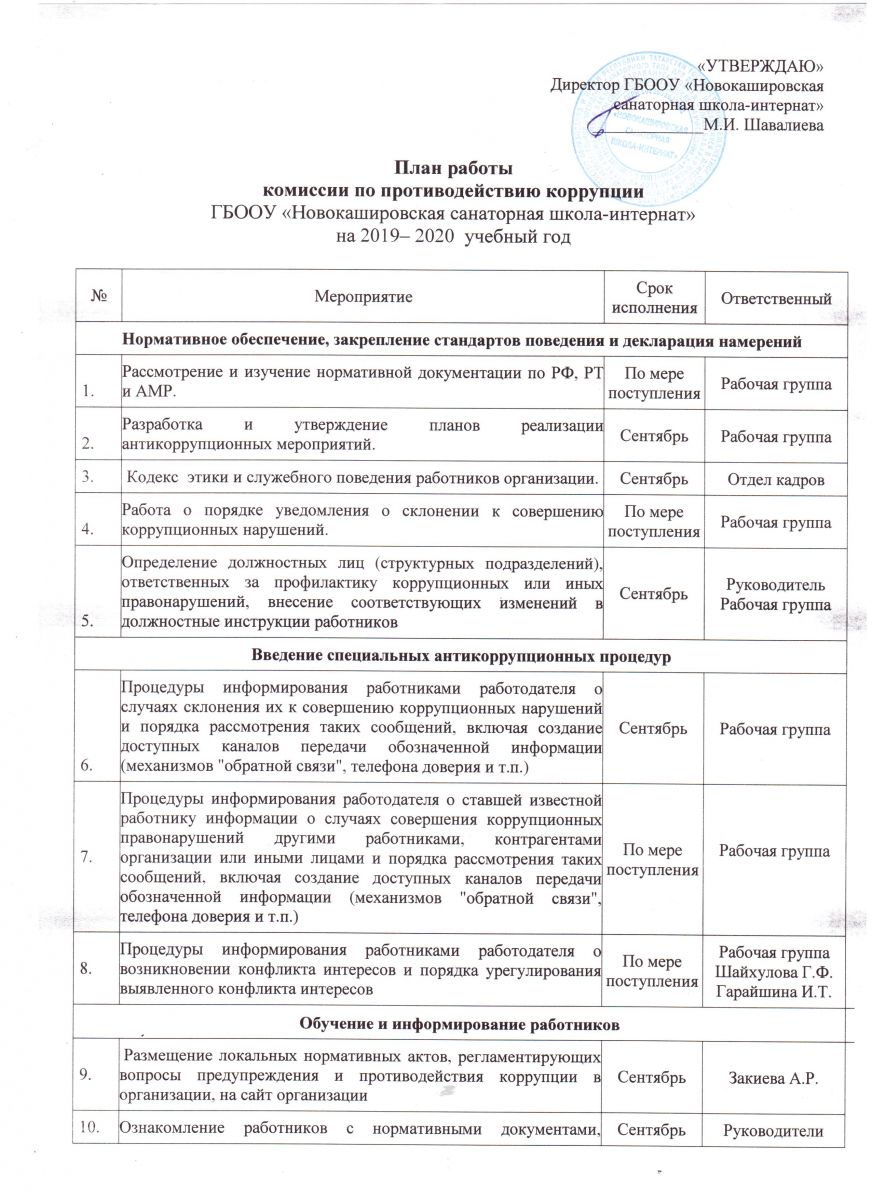 /План работы комиссии по противодействию коррупции на 2019-2020 учебный год (1 стр) / Коррупциягә каршы көрәшү комисиясе планы 2019-2020 нче уку елы jpeg