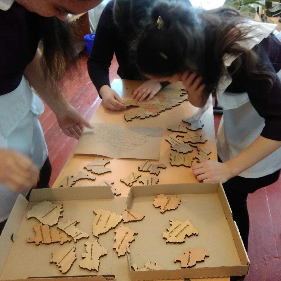На уроке географии ученики 8 класса собрали спилс-карту Республики Татарстан и России.