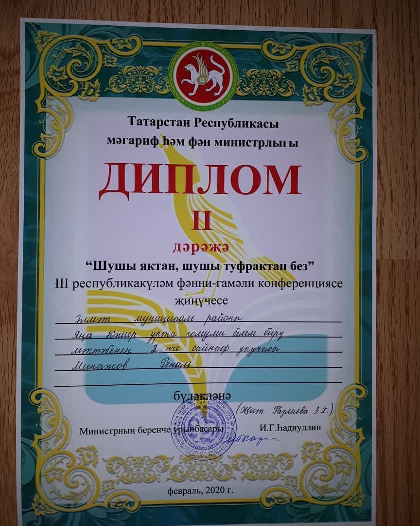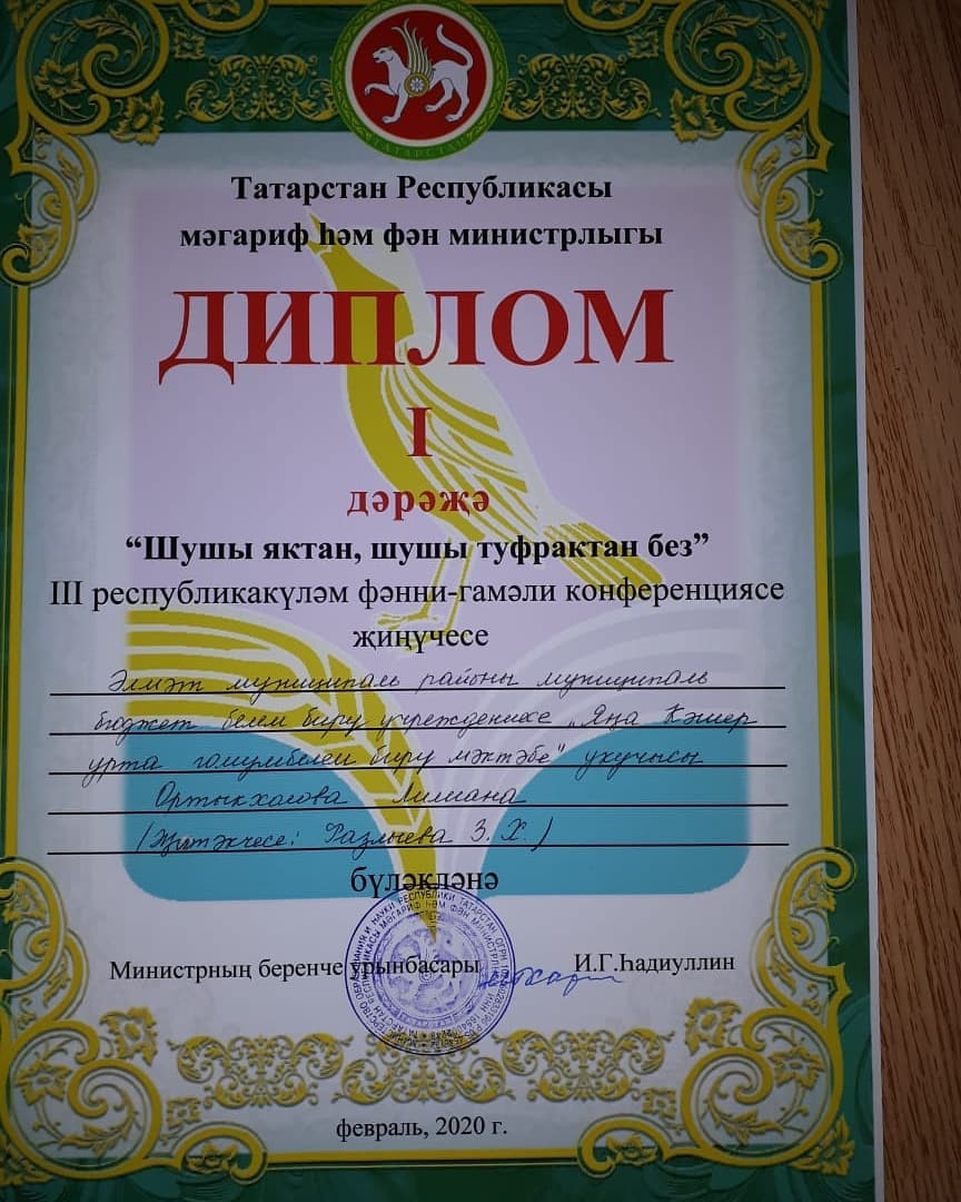 Сегодня ученики 2 класса приняли участие в Республиканской научно-практической конференции в пгт. Джалиль. По результатам конференции Ортыкхолова Лилиана заняла 1 место, а Минажов Реналь 2 место. Научный руководитель: Фазлыева З. Х.