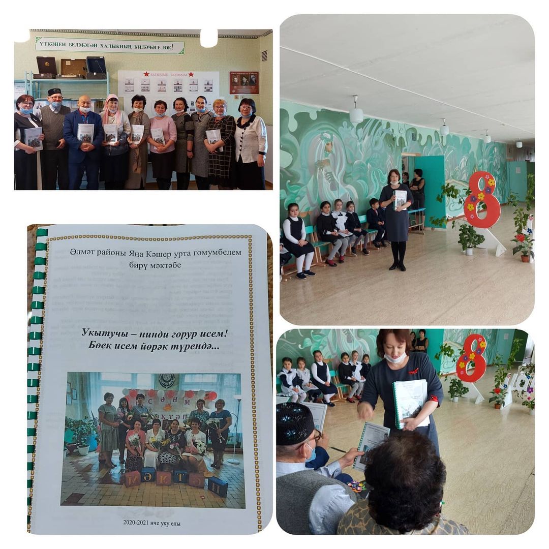 Учитель истории и обществознания Валеева Г. Г. презентовала свой огромный труд - проектную работу с учащимися старших классов. Вниманию присутствующих был представлен сборник "Укытучы - нинди горур исем!" об учителях-ветеранах, проработавших в нашей школе более 20 лет. Красочные альбомы с именами и фотографиями были отпечатаны в типографии г. Казани благодаря финансовой поддержке Халимова Рамиля Сиреневича. Альбомы были подарены учителям. Этот реально уникальный подарок, подтверждающий славную историю нашей школы, стал приятным сюрпризом для всех.