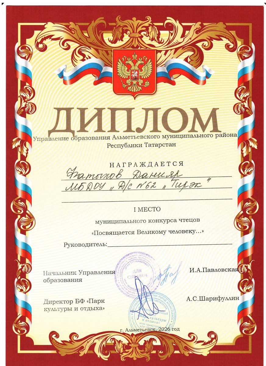 Әлмәт шәһәренең 3 нче балалар бакчасында бөек шагыйребез Габдулла Тукайның тууына 140 ел тулу уңаеннан "Бөек кешегә багышлана..." исеме астында муниципаль шигырь бәйгесе булып узды. Әлеге бәйгедә шигырь яратучы 22 бала катнашты. Безнең балалар бакчасыннан мәктәпкә хәзерлек төркеменнән ФАТЫХОВ ДАНИЯР Г. Тукайның "Пар ат" шигыре белән катнашты һәм ул БЕРЕНЧЕ УРЫНГА лаек булды. Без Данярны чын күңелдән тәбрик итәбез һәм алда зур уңышларга ирешүен телибез. -