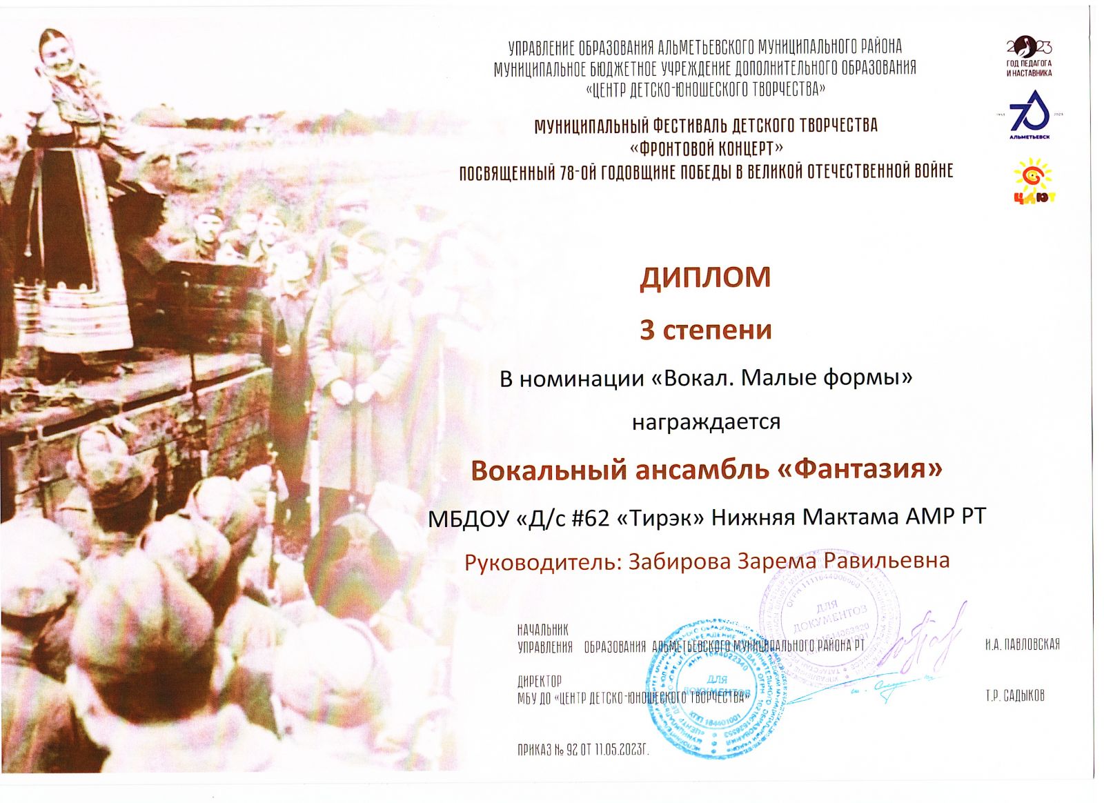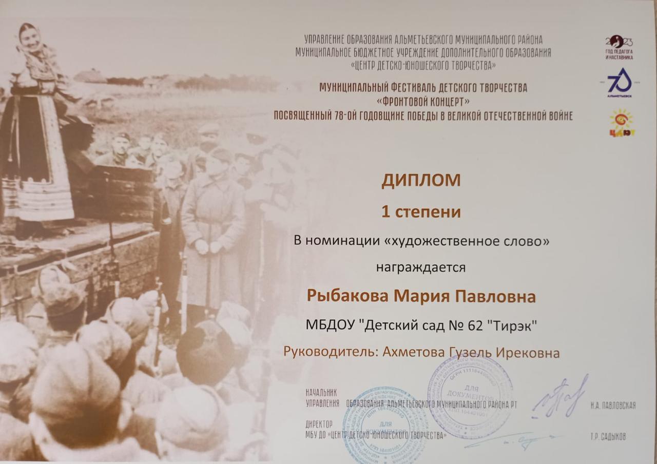 Воспитанники приняли участие в муниципальном фестивале детского творчества "Фронтовой концерт" посвященный 78 - ой годовщиен ВОВ и были награждены: вторая младшая группа дипломом 1 степени в номинации "Вокальный ансамбль "Малышата"; Рыбакова Мария (средняя группа) дипломом 1 степени в номинации "Художественное слово", воспитанники старшей и подготовительной группы дипломом 3 степени в номинации "Вокальный ансамбль". Выражаем благодарность всем участникам конкурса!
