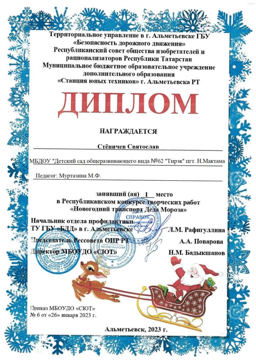 Воспитанники старшей группы Ахметов Арлан, Степичев Святослав, Хисамов Самир, куратор: воспитатель Муртазина М.Ф.) участвовали в Республиканском творческом конкурсе "Новогодний транспорт Деда Мороза" и стали победителями. Поздравляем ребят и желаем творческих успехов! -
