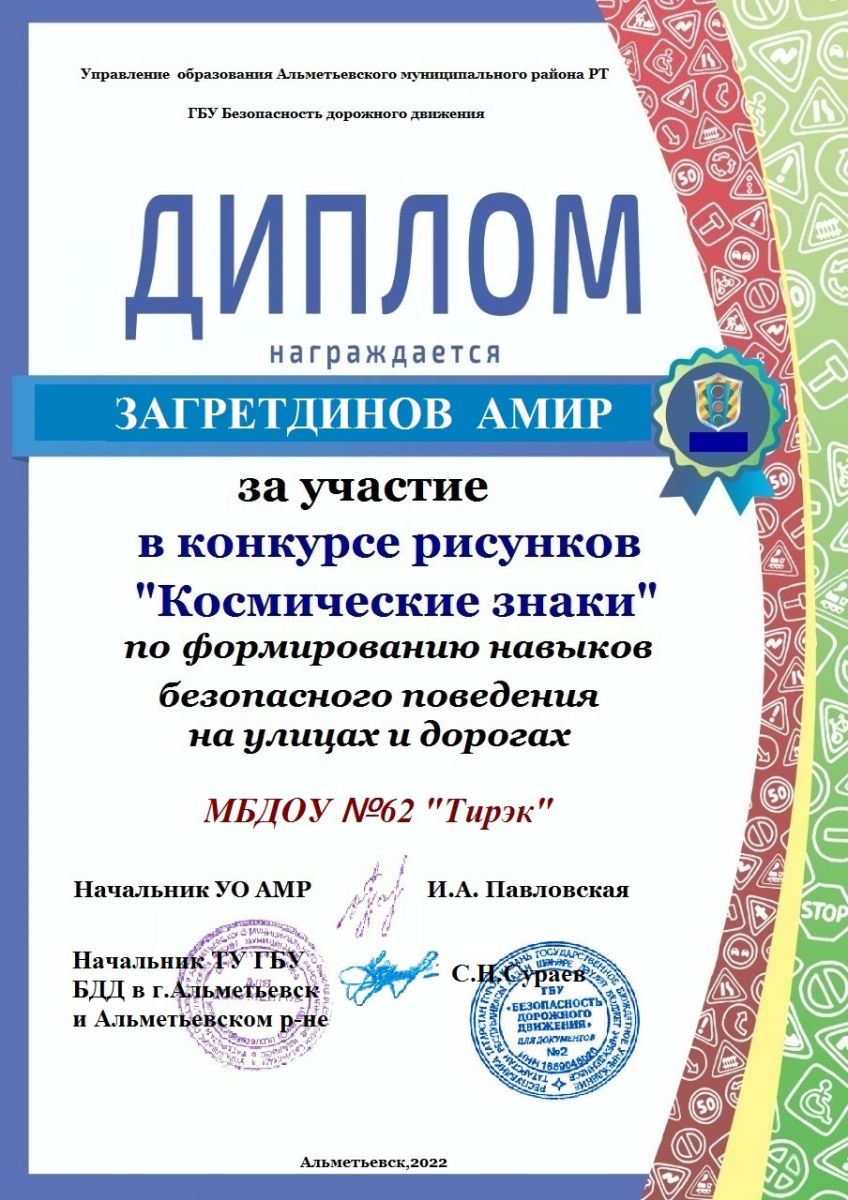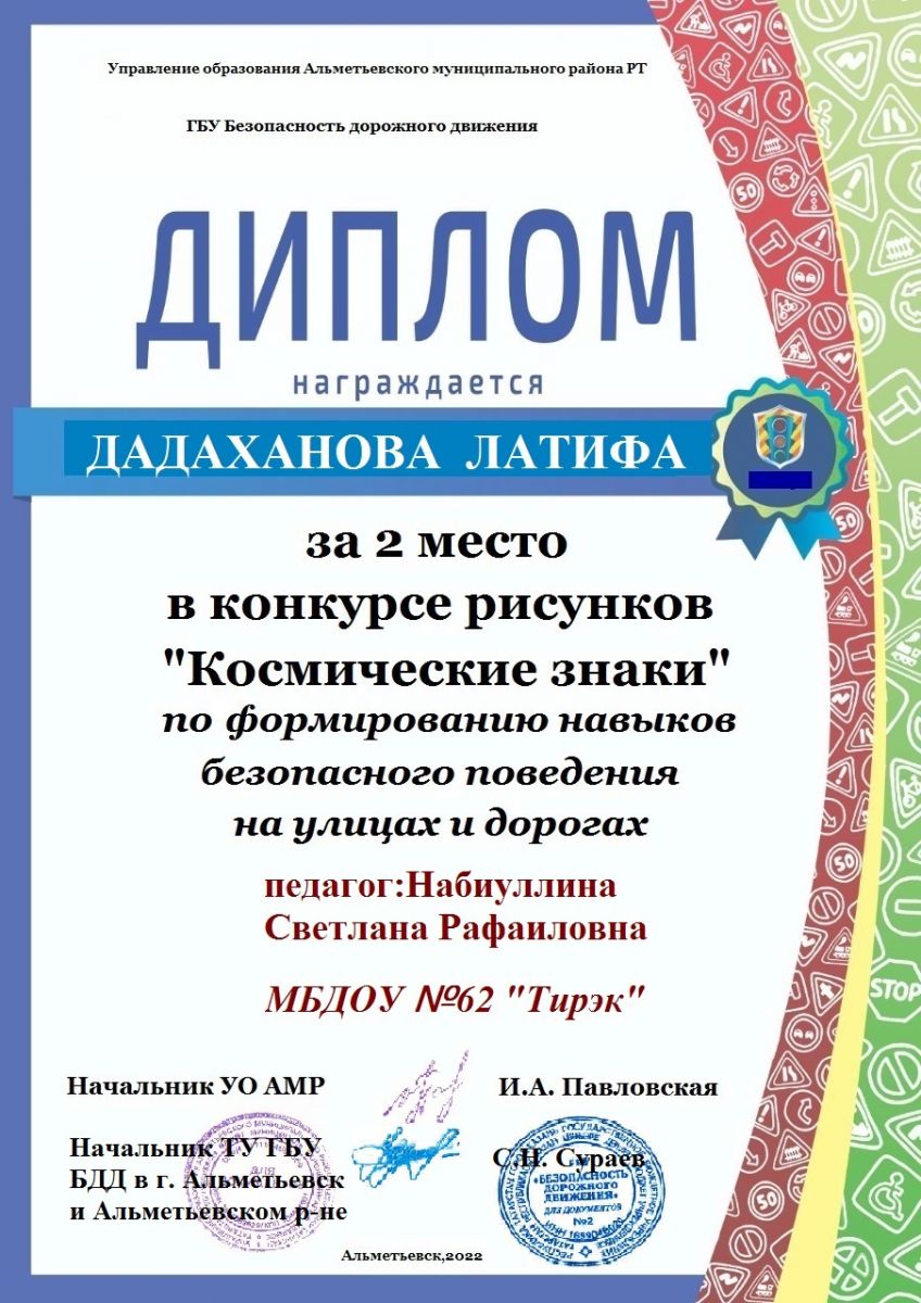 Воспитанники подготовительной группы (Дадаханова Латифа и Загретдинов Амир) участвовали в городском конкурсе рисунков "Космические знаки" по формированию навыков безопасного поведения на улицах и дорогах. По итогам конкурса Дадаханова Латифа заняла 2 место. -