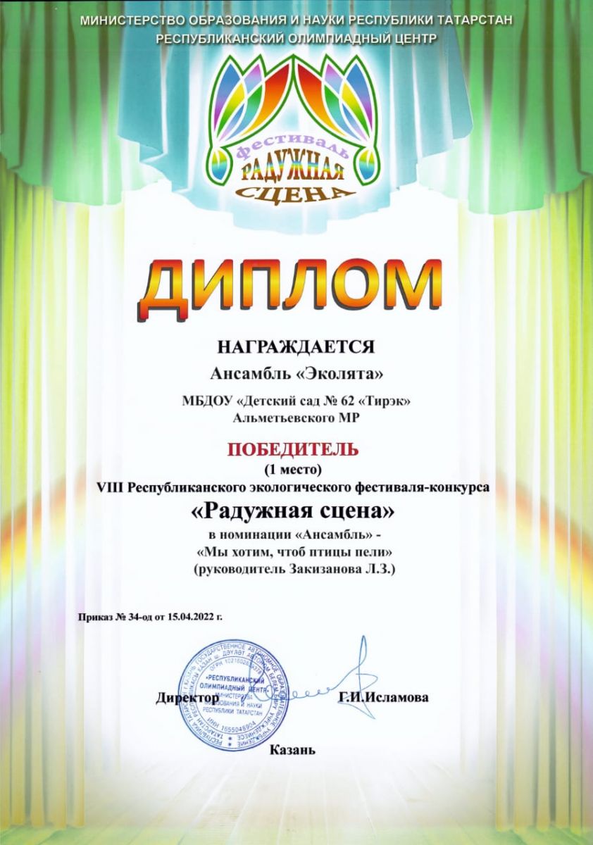 Педагоги (Набиуллина С.Р., Мингбаева Г.Ф., Закизанова Л.З.) и дети подготовительной группы "Звездочки" участвовали в VIII Республиканском экологическом фестивале - конкурсе "Радужная сцена" и стали победителями. ДИПЛОМ ПРИЗЕРА, ДИПЛОМ ПОБЕДИТЕЛЯ