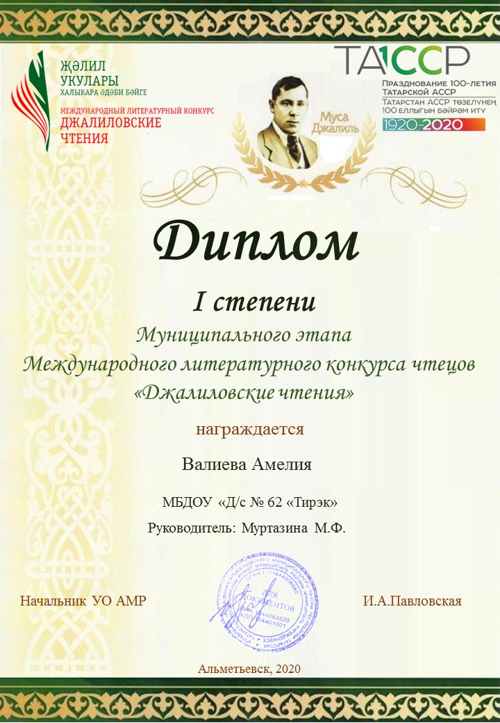 Валиева Амелия воспитанница подготовительной группы и Валиева Сабина воспитанница средней группы участвовали в муниципальном этапе Международного литературного конкурса чтецов "Джалиловски чтения" и награждены дипломом 1 степени (Валиева Амелия) и дипломом 3 степени (Валиева Сабина). Поздавляем! -