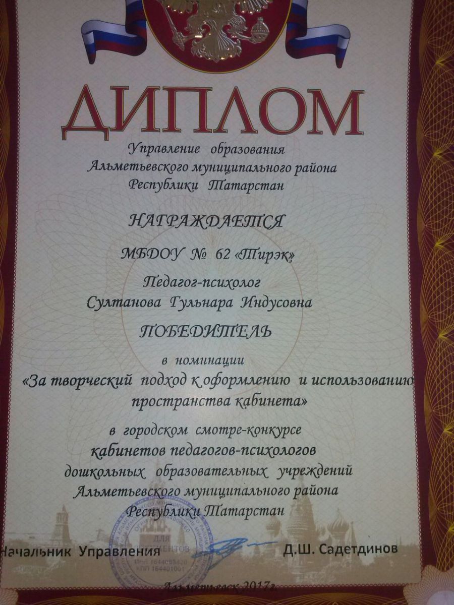 По итогам городского смотра-конкурса кабинетов педагогов-психологов дошкольных образовательных учреждений Альметьевского муниципального района РТ наш детский сад стал ПОБЕДИТЕЛЕМ в номинации "За творческий подход к оформлению и использованию пространства кабинета" (Педагог-психолог Султанова Г.И.). -