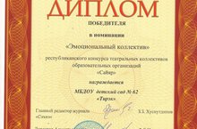 Коллектив детей детского сада под руководством воспитателя Петровой З.И. награжден дипломом ПОБЕДИТЕЛЯ в номинации "Эмоциональный коллектив" республиканского конкурса театральных коллективов образовательных организаций "Сайяр".