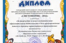 Коллектив ДОУ награжден дипломом в номинации "За творчество и поиск воспитательно- образовательной деятельности в деле предупреждения детского дорожно - транспортного травматизма" городского конкурса "Светофорик - 2016".