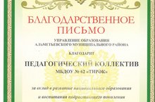 Коллектив ДОУ награжден благодарственным письмом за вклад в развитие национального образования и воспитания подрастающего поколения.