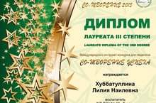 Поздравляем воспитателя Хуббатуллину Л.Н. с победой (лауреат 3 степени) в международном конкурсе педагогов.