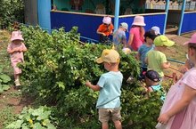 Чтобы ближе познакомиться с ягодным миром, участники мероприятия превратились в «охотников» за ягодами. На садово-огородном участке детского сада ребята полакомились поспевшими ягодами черной смородины.
