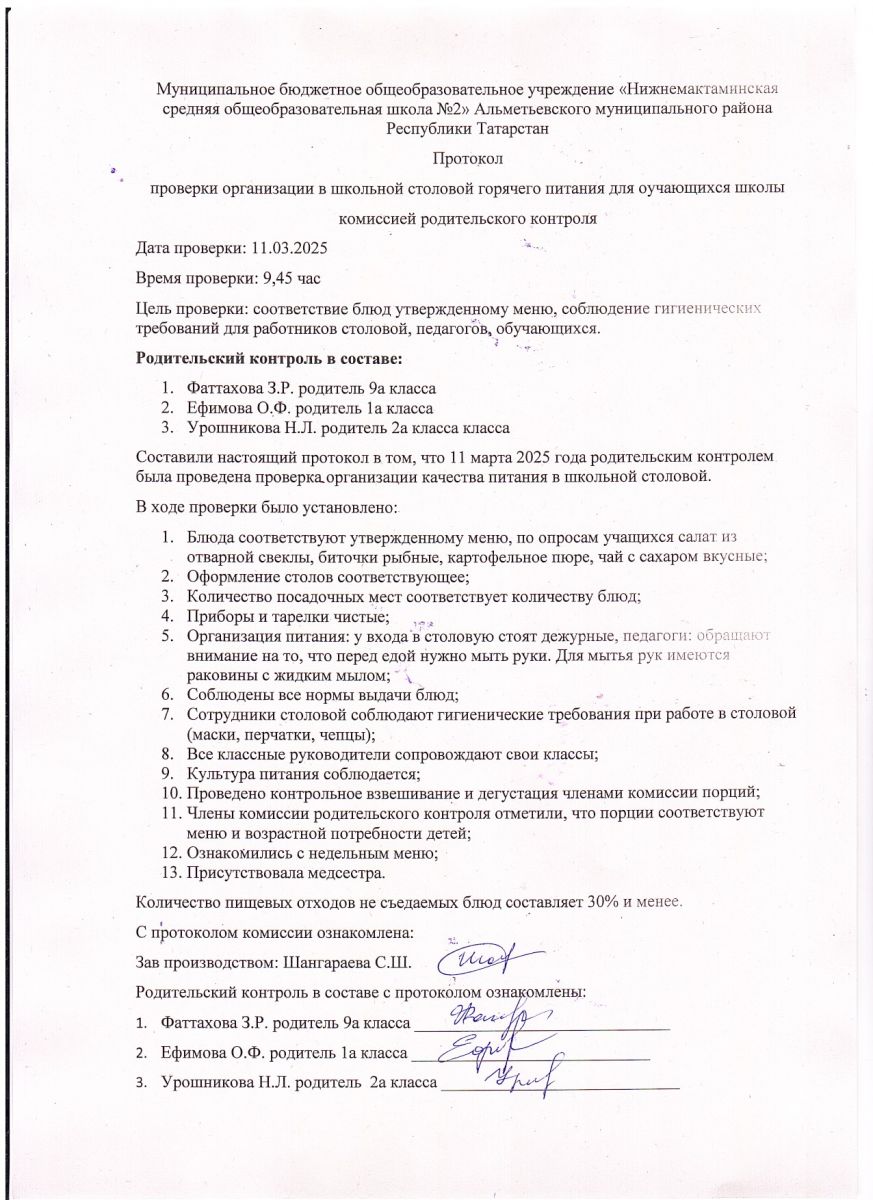 Родительский контроль за качеством питания в МБОУ СОШ в марте 2025 года
