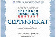 Ежегодно Ассоциация юристов России совместно с организаторами и партнерами проводит Всероссийский правовой (юридический) диктант. Диктант рассчитан на граждан в возрасте от 14 лет. Учащиеся 8 класса приняли активное участие в диктанте: ответили на 40 вопросов, после чего получили сертификаты с персональными результатами.