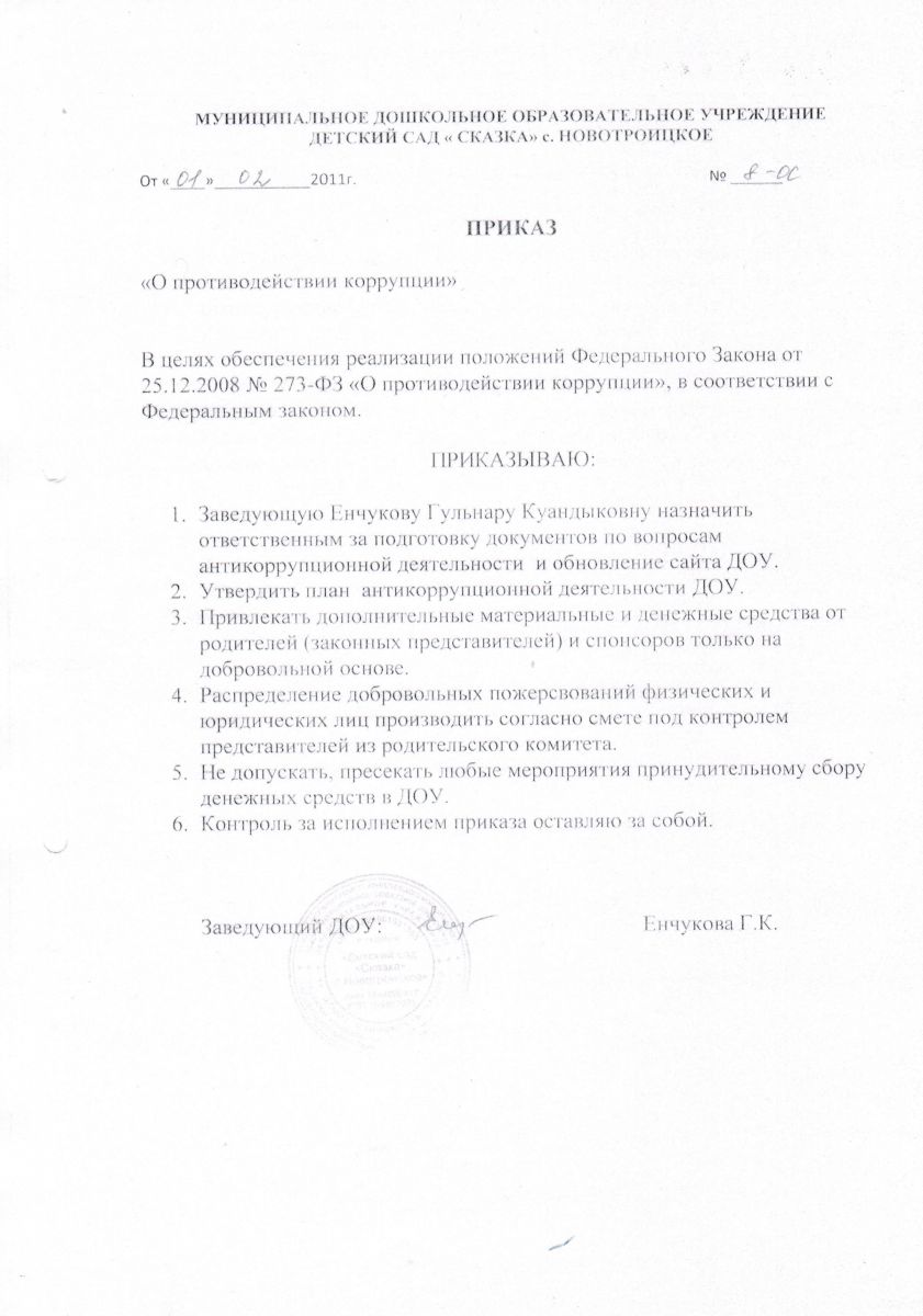 Приказ по МБДОУ "Д/с "Сказка"с.Новотроицкое" "Об организации антикоррупционной деятельности в ДОУ"