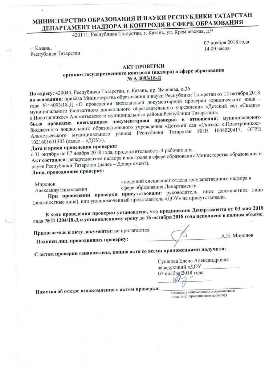 Предписания органов, осуществляющих государственный контроль (надзор) в сфере образования, отчетов об исполнении таких предписаний (до подтверждения органом, осуществляющим государственный контроль (надзор) в сфере образования, исполнения предписания или признания его недействительным в установленном законом порядке: за 2024-2025 учебный год нет