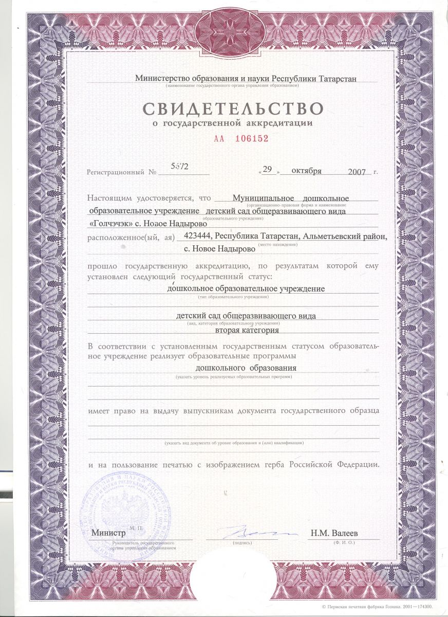 МБДОУ «Детский сад общеразвивающего вида «Голчэчэк» с.Новое Надырово» Альметьевского муниципального района РТ
