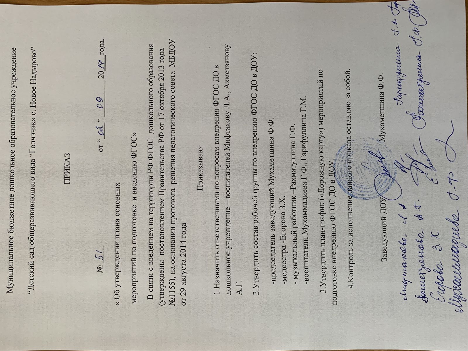 5.3.2 Приказ ДОУ об утверждении Плана мероприятий введения ФГОС ДО.