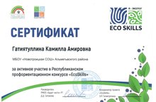 Сертификат за активное участие в Республиканском профориентационном конкурсе "EcoSkills" получила наша ученица 8 класса Гатиятуллина Камилла. Поздравляем!