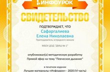 Методическая работа - важнейшее звено в работе педагога дополнительного образования. Прямой эфир преподавателя вокального отделения Сафаргалиевой Е.Н. на тему "Певческое дыхание" опубликован в печатном издании "Лучшие материалы Инфоурок-2020" (VI часть)