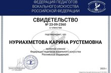 Нуриахметова Карина Рустемовна стала членом Федерации педагогов вокального искусства Российской Федерации! Федерация педагогов вокального искусства – это инициативный творческий проект от кинопродюсерского центра «SKEY-FILM», который своей целью ставит - создание единой площадки для педагогов вокального искусства всей страны. Поздравляем