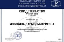 Иголкина Дарья Дмитриевна стала членом Федерации педагогов вокального искусства Российской Федерации! Федерация педагогов вокального искусства – это инициативный творческий проект от кинопродюсерского центра «SKEY-FILM», который своей целью ставит - создание единой площадки для педагогов вокального искусства всей страны. Поздравляем!