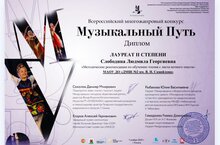 Поздравляем Слободину Людмилу Георгиевну с победой во Всероссийском многожанровом конкурсе «Музыкальный путь». Номинация "Педагогический триумф" с методической работой на тему: "Методические рекомендации по обучению чтения с листа нотного текста".
