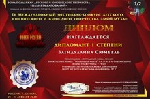 Поздравляем Загидуллину Сюмбель, благодарность педагогу Иголкиной Дарье Дмитриевне, за подготовку участника к IV международному фестивалю-конкурсу "Моя муза"