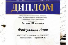 Поздравляем Файзуллину Алию, Лауреата III степени в открытом Республиканском конкурсе юных музыкантов имени Фарида Яруллина в номинации "Общее фортепиано", благодарим Гордееву Светлану Владимировну за педагогическое мастерство!