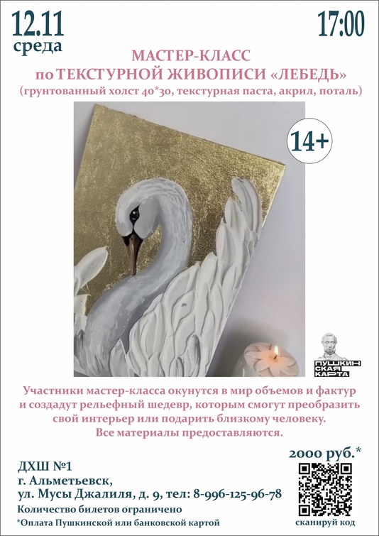 На мастер-классе вы будете обеспечены всем необходимым. Рисовать будем на холсте с помощью текстурной пасты и акрила мастихином под чутким руководством преподавателя. По окончанию вы уйдете с готовым произведением искусства.Адрес: ДХШ N1, ул. М. Джалиля, 9