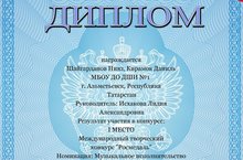 13.05.17. На Международном творческом конкурсе "Росмедаль" (г.Красноярск), в номинации "Музыкальное исполнительство" дуэт баянистов (Шайгарданов Нияз, Кирамов Даниль) получили I место. Ансамбль "Сюрприз" получил II место. (преподаватель Исхакова Л.А.). Поздравляем!