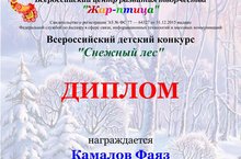 Всероссийский центр развития творчества "Жар-птица" в феврале проводит Всероссийский детский конкурс "Зимний лес". (г. Челябинск) Учащийся 1 класса Камалов Фаяз (преподаватель Исхакова Л.А.) принял участие в номинации "Инструментальное исполнительство" и получил звание Дипломанта. Поздравляем!