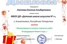 Прошел I Международный конкурс «В преддверии Нового года…» (г.Чебоксары). По итогам конкурса учащиеся Латыпова Ралина и Лаптева Евгения (преподаватель Чадаева С.Ю.) стали лауреатами. Поздравляем!!!