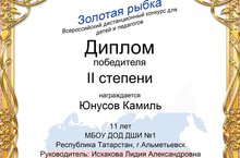 17.02.17. На Всероссийском дистанционном конкурсе для детей и педагогов "Золотая рыбка" (г. Ростов-на-Дону) в номинации: "Инструментальное исполнительство" учащийся 3 класса Юнусов Камиль (преподаватель Исхакова Л.А.) получил Диплом победителя II степени. Поздравляем!
