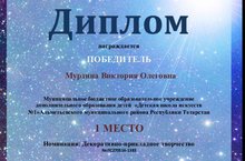 Прошел Всероссийский конкурс детского творчества "Космос" (г.Оренбург) По итогам конкурса в номинации: "Декоративно-прикладное творчество" учащиеся ДШИ 1 (преподаватель Чадаева С.Ю.) заняли призовые места: Мурзина Виктория-1 место, Ипеева Дарья - 1 место, Грачева Анна - 2 место, Савельева Варвара - 3 место. Поздравляем победителей!
