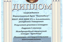 22.03.2016. На Международном творческом конкурсе "Артобзор" состоявшемся в городе Красноярске, в номинации "Инструментальное исполнительство" фортепианный дуэт "Кантабиле" (преподаватели Максютина Н.И. и Фатыхова Л.Н.) получил звание Лауреата I степени! Поздравляем и желаем творческих побед!