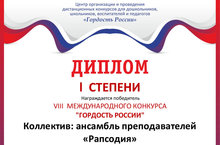 На VIII Международном дистанционном конкурсе для дошкольников, школьников, воспитателей и педагогов "Гордость России" (г.Москва), в номинации: "Стань звездой!" (музыкальный конкурс), Ансамбль преподавателей "Рапсодия" получил Диплом I степени. Поздравляем!